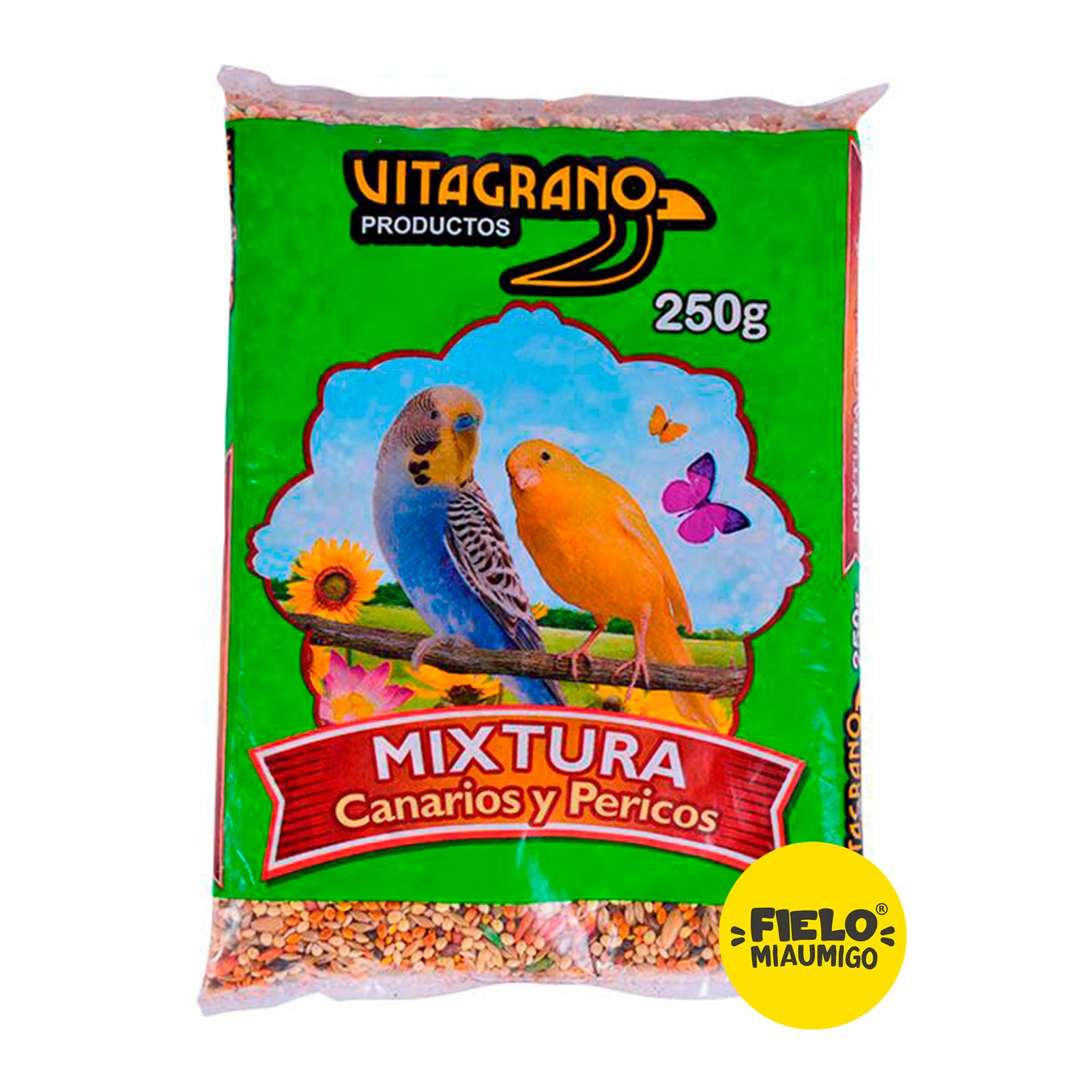 Dale a tus amigos plumíferos la nutrición que merecen. Encuentra la Mixtura Vitagrano Canarios y Pericos 250g en Fielo Miaumigo, donde nuestra pasión es el cuidado de tus mascotas. 🐾⭐